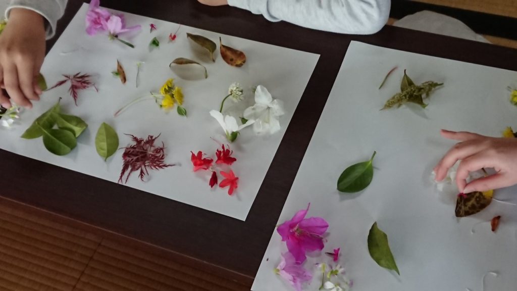 触ったり、匂いをかいだり、見たりして、色んな発見もありつつ花や葉っぱを集めました。