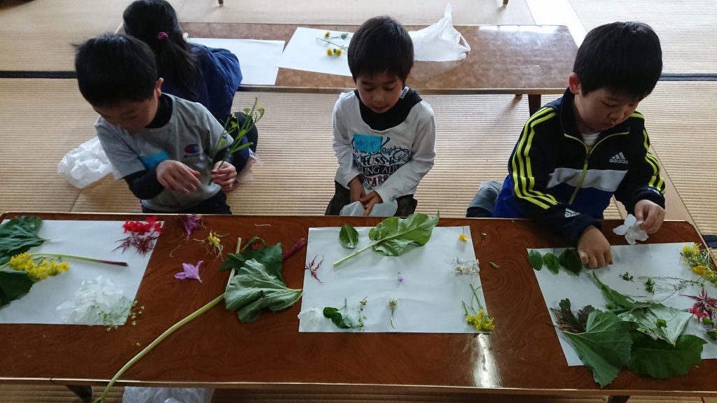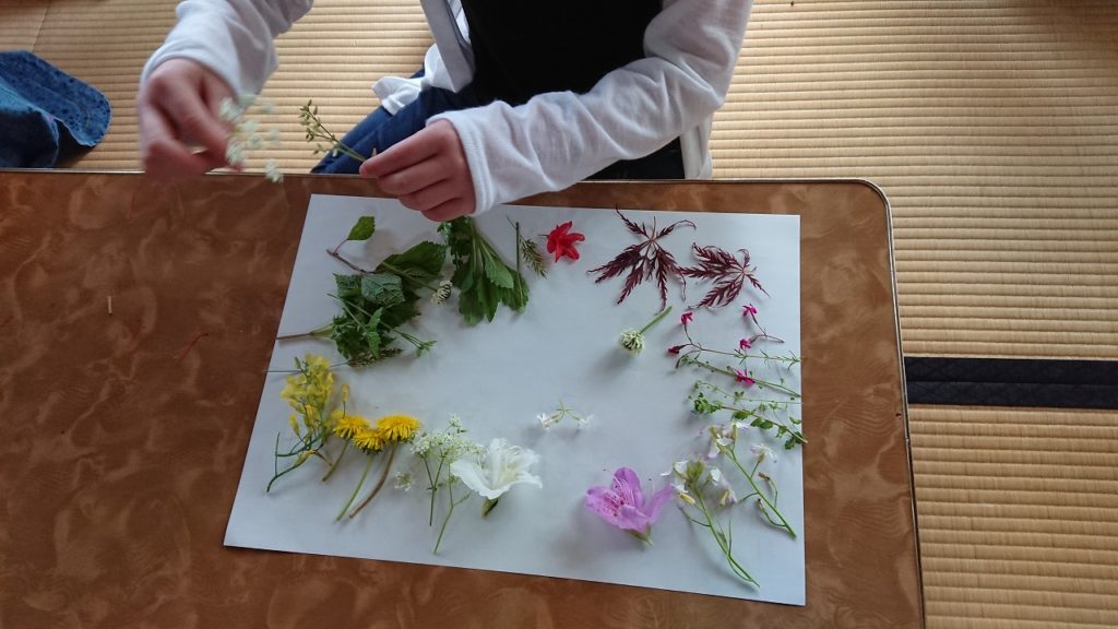 綺麗に並べる子、石をお寺に見立てて草花で地図を作る子、お弁当を作る子、自分の部屋を作る子、それぞれがそれぞれに考えて花と葉っぱで表現をする。