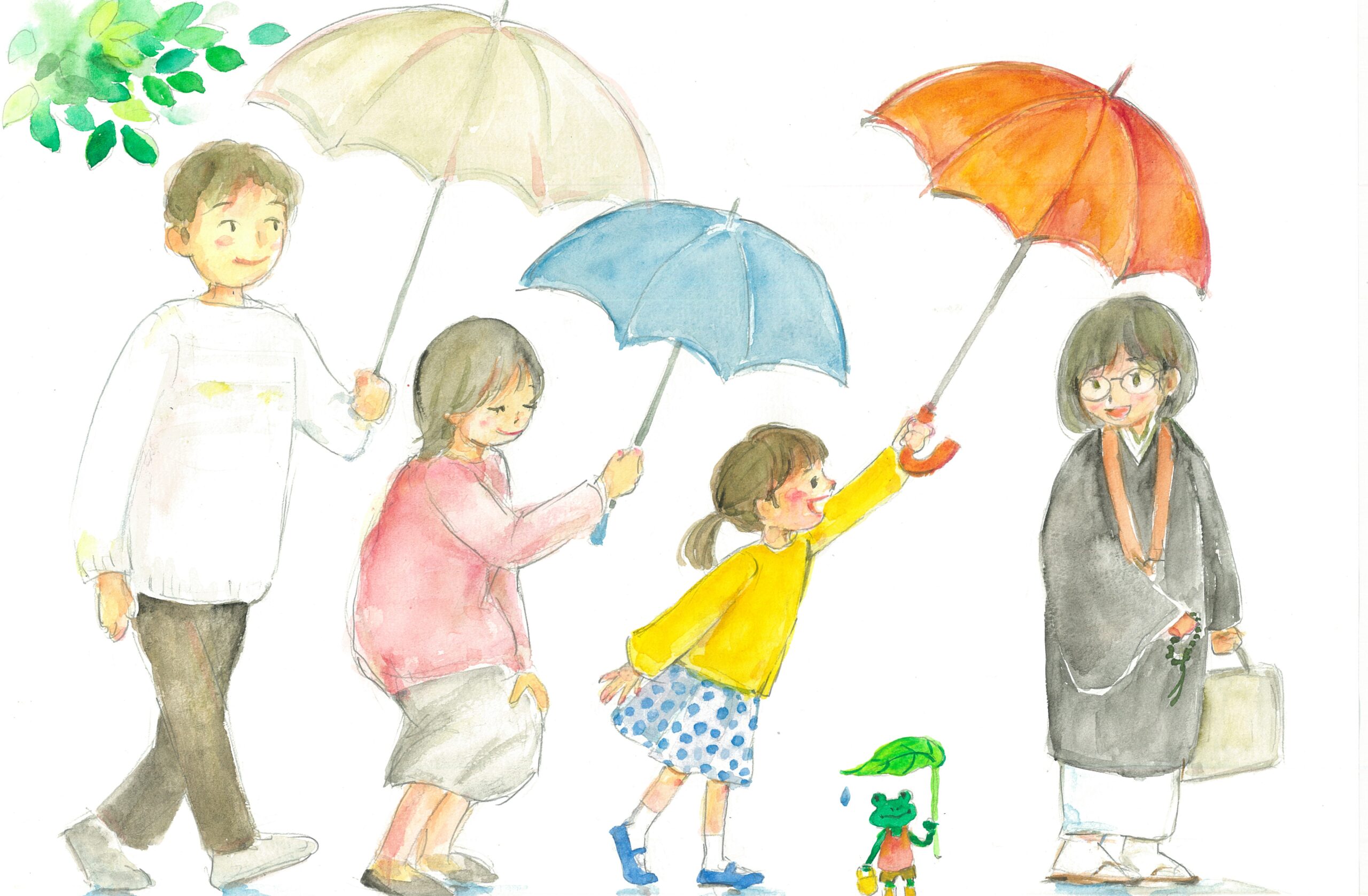 オリジナルデザインの雨の日にそれぞれがそれぞれに傘をさしてあげる優しさを描いたの水彩画のポストカード。
