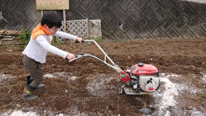 子ども寺子屋をやるにあたり、おちび隊員が張り切っており、自ら耕運機を手にして、堆肥や石灰を畑に混ぜてくれました。