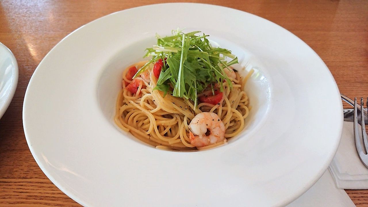 で、メインのパスタはエビとルッコラのアーリオオーリオ