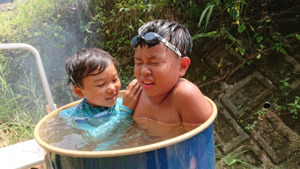 バケツリレーで水を運ばせて、火を焚いて、お風呂に入る。