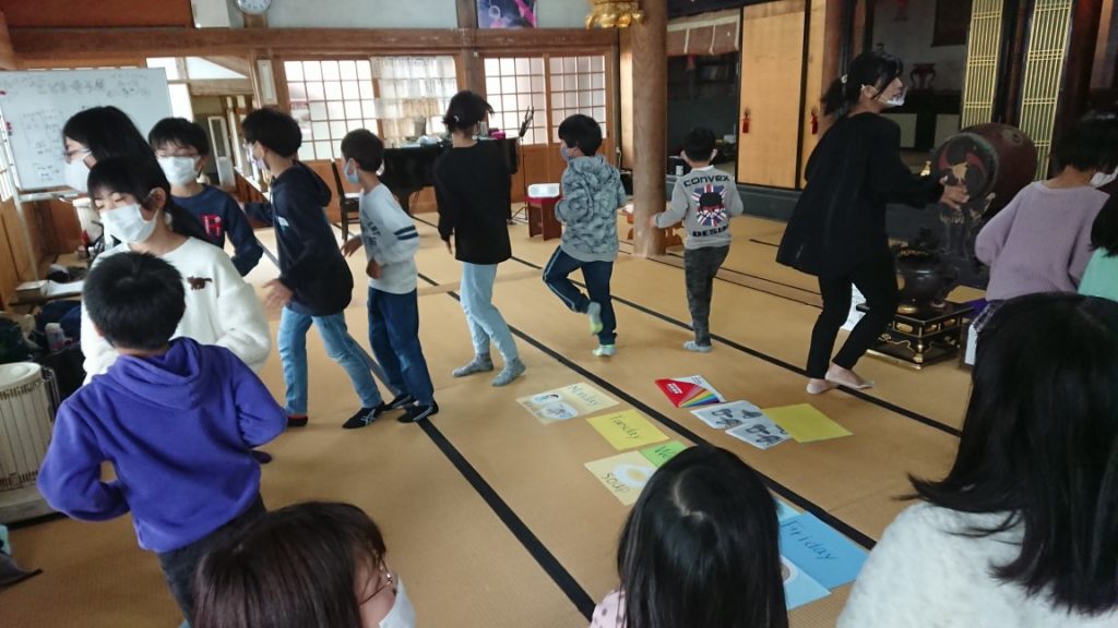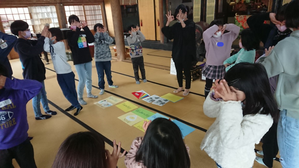 英語の童謡を使ったゲームや宝探しをしてスペルを組み合わせていくゲームなど楽しみながら英語に触れる機会を作ってもらいました。