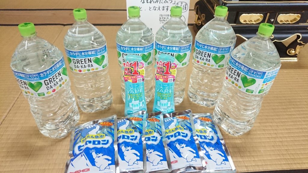 沢山のお菓子や飲み物、またワークショップで使う物や熱中症対策のグッズ、御仏前など様々な支援をして頂きました。