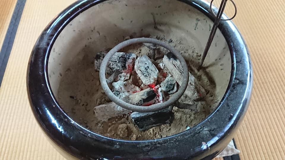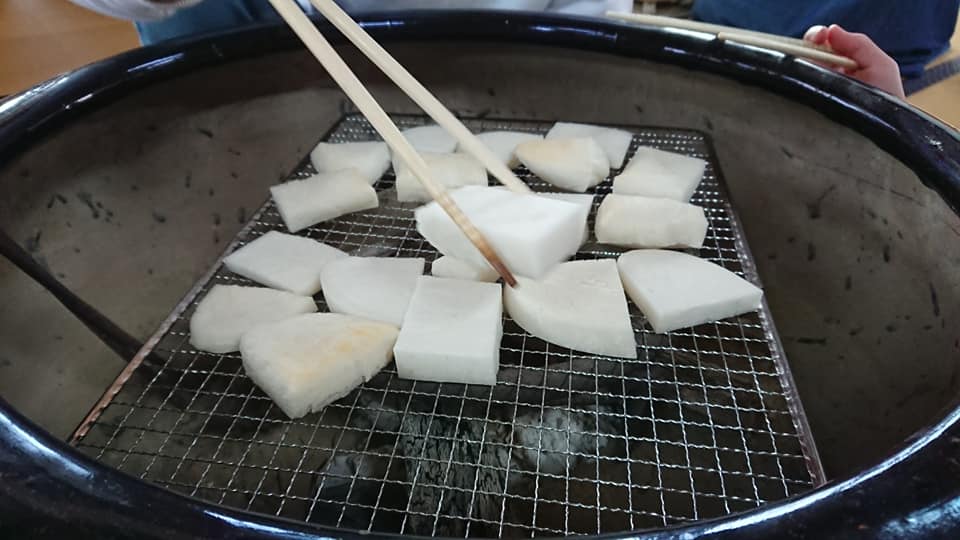 囲炉裏に炭を入れたのでお餅を焼きました。